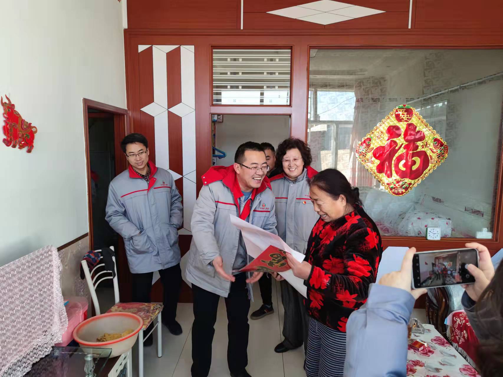 在位于玉泉區(qū)百什戶村、班定營村、達賴庒村,公司燃煤散燒綜合治理項目“煤改氣”用戶家中,劉秀清書記帶領大家進行燃氣安全查漏排查。每到一戶,認真細致的為用戶進行燃氣查漏工作,并與村民促膝交談、話家常、送春聯(lián),與村民共同慶祝喜慶、祥和、綠色環(huán)保的中國年。